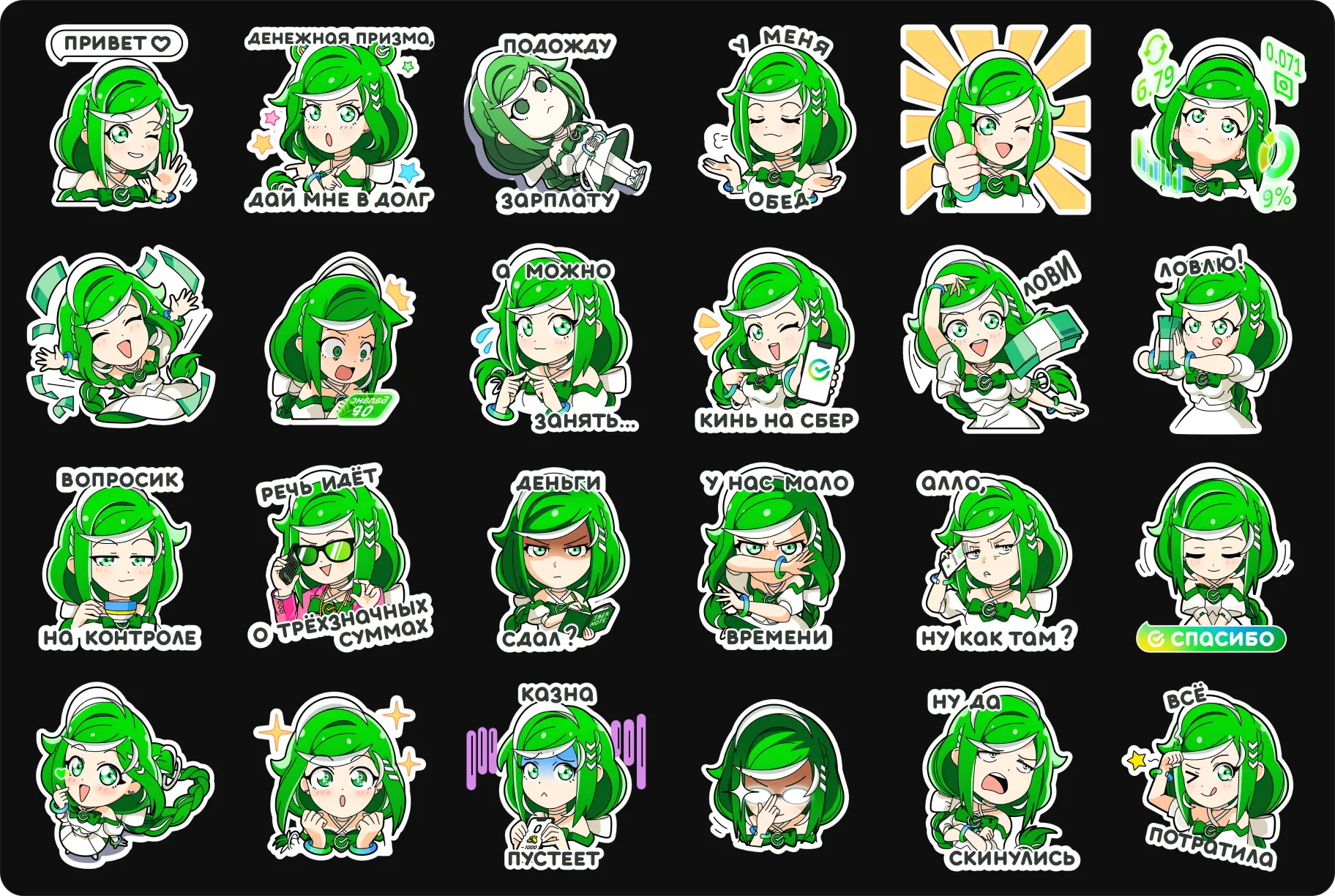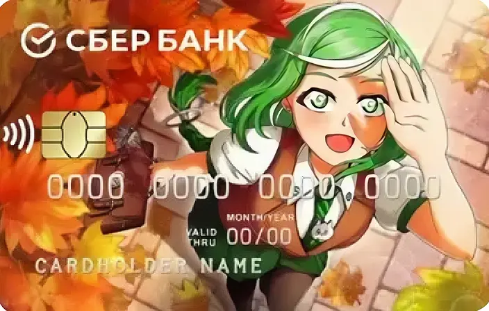 Сначала Сбер-тян появилась на серии пластиковых платежных карт, а затем мы разработали серию заставок и пакет стикеров. Они доступны в официальном приложении Сбербанка на iOS и Android